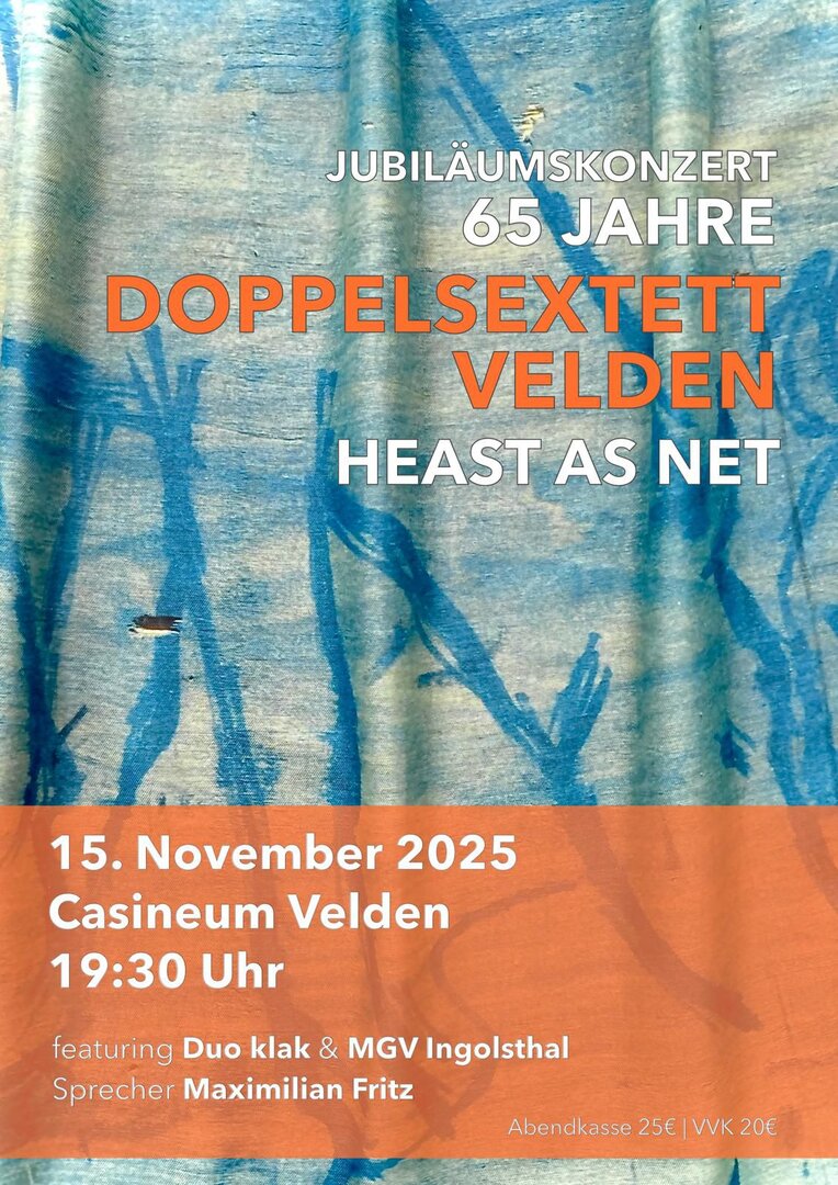 Das Doppelsextett Velden lädt am Samstag, den 15. November 2025, um 19:30 Uhr zu einem ganz besonderen musikalischen Abend ins Casino Velden. Gefeiert wird 65 Jahre Chorgeschichte, eingebettet in ein abwechslungsreiches Jubiläumsprogramm unter dem Motto „Heast as net“.